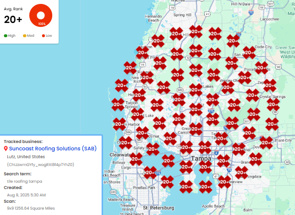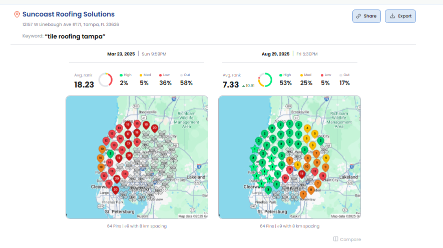 By optimizing the Google Business Profile, adding a verified address, and expanding local citations, Suncoast Roofing Solutions’ average map ranking for the keyword “tile roofing Tampa” improved dramatically, from position 18.23 in March 2025 to 7.33 by August 2025, a 10.9-point improvement.