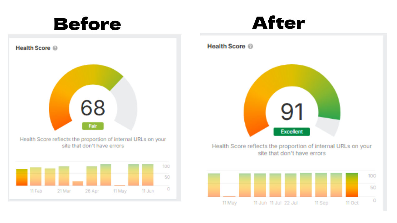 At the start of the project, the website’s technical health score stood at 68 (Fair), indicating multiple crawl and indexation issues. After a series of technical audits, schema implementations, and site clean-ups, the score climbed to 91 (Excellent), a 34% improvement.